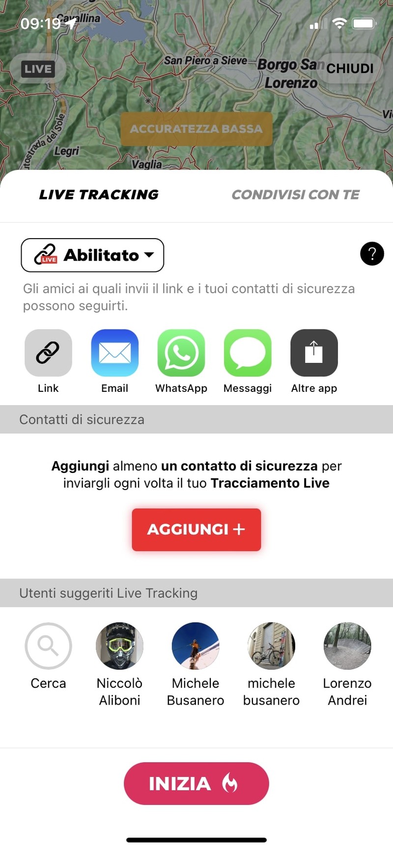 With WHIP LIVE you have a tool for safety to rely on to prevent danger or solve an emergency. Before tracking, you can enable LIVE TRACKING to be monitored during your activity by one or more contacts you have selected.